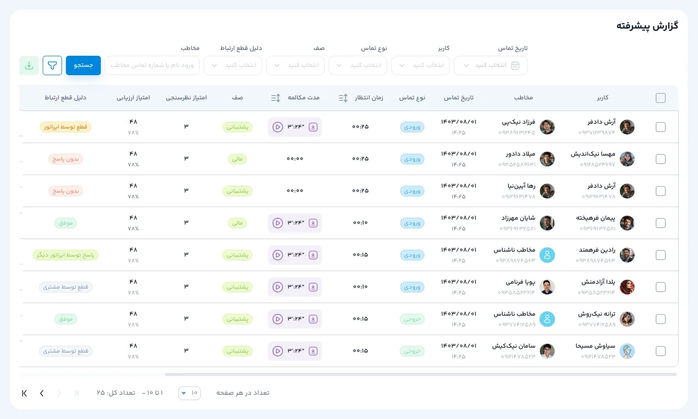 با ابزارهای مانیتورینگ لحظهای، گزارشهای پیشرفته و ارزیابی عملکرد، پاسخگویی اپراتورها را رصد کنید. این امکانات به شما کمک میکند کیفیت تماسها را بهبود بخشید، بهرهوری تیم را افزایش و سطح خدمات را ارتقا دهید.